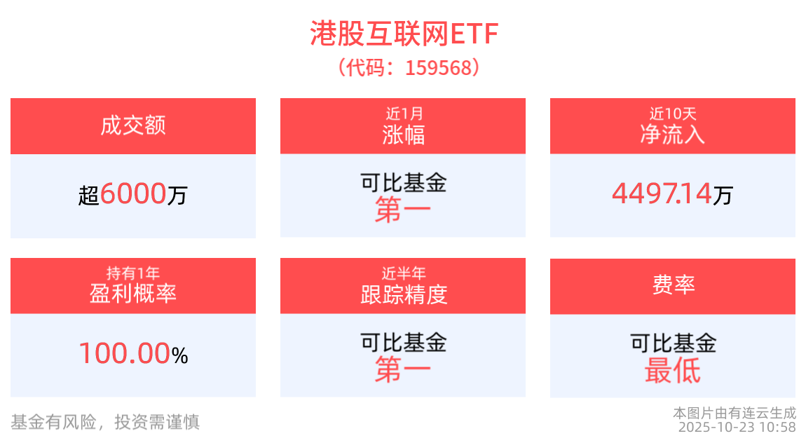 流动性方面,港股互联网ETF盘中换手15.97%,成交6134.25万元,市场交投活跃。拉长时间看,截至10月22日,港股互联网ETF近1年日均成交2.17亿元。